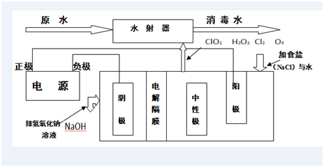 电解食盐(NaCl)法 YS-DJ 系列二氧化氯协同消毒剂发生器是一种电解装置,它采用特殊电极(钛基涂覆钌、铑、铱、铂等多种稀贵金属)及电解隔膜(基材为进口 PVC),电解饱和食盐水溶液,产生含 ClO2 、Cl2 、O3、H2O2等多种成分的协同消毒气体,通过水射器将协同消毒气与水充分混合、溶解产生二氧化氯协同消毒剂。