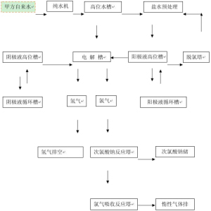 公用工程包含,纯水系统,制冷机组,制氮机组.其中纯水系统,用于溶盐,洗槽,阴极液补水使用,制冷机组负责给次氯酸钠反应塔及电解槽高负荷工况下冷却降温,保证系统正常运行。